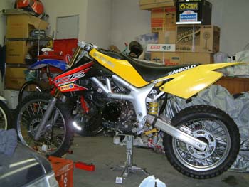 ![]() ハンドルはまだついてませんが、なんとか形になってきました。シュラウドはCR125のものを使用します。電装系が大変です。 |